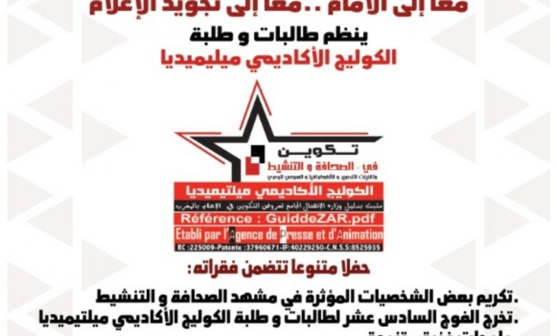 تحت شعار “معاً إلى الأمام… معاً إلى تجويد الإعلام”، ينظم الكوليج الأكاديمي ميلتيميديا بإشراف الإعلامي المميز محمد البقالي حفل تخرج مميز في مدينة مراكش الحمراء في 17 فبراير الجاري.